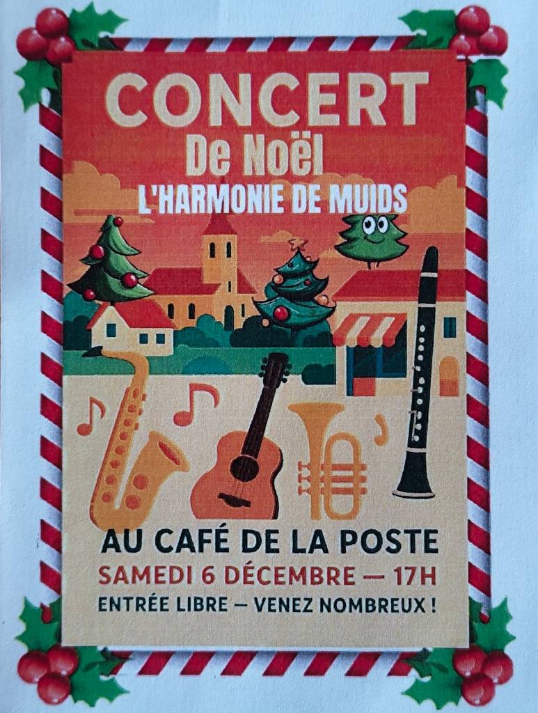Quoi de plus réconfortant, en cette période de fêtes, que de se retrouver autour d’un concert de Noël chaleureux et convivial ? Cette année, l’Harmonie de Muids vous donne rendez-vous pour un moment festif et enjoué au Café de la Poste, le samedi 6 décembre à 17h. Dans une ambiance détendue et joyeuse, laissez-vous porter par les mélodies envoûtantes de Noël, interprétées avec talent par les musiciens de l’harmonie.
