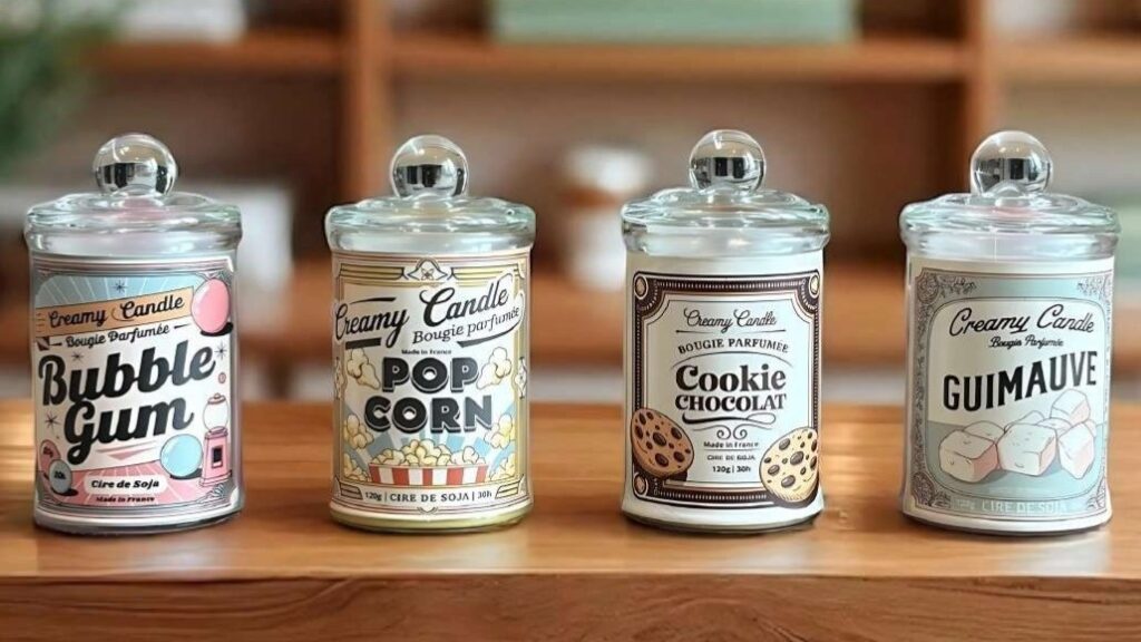 - des bougies aux arômes de fêtes (sucre d’orge, sapin, bûche de Noël…).